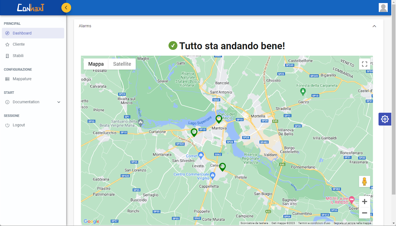 Se non è presente nessun impianto in allarme, viene presentata direttamente la cartina con gli impianti posizionati e la rassicurante scritta che informa come tutto stia procedendo per il meglio.
