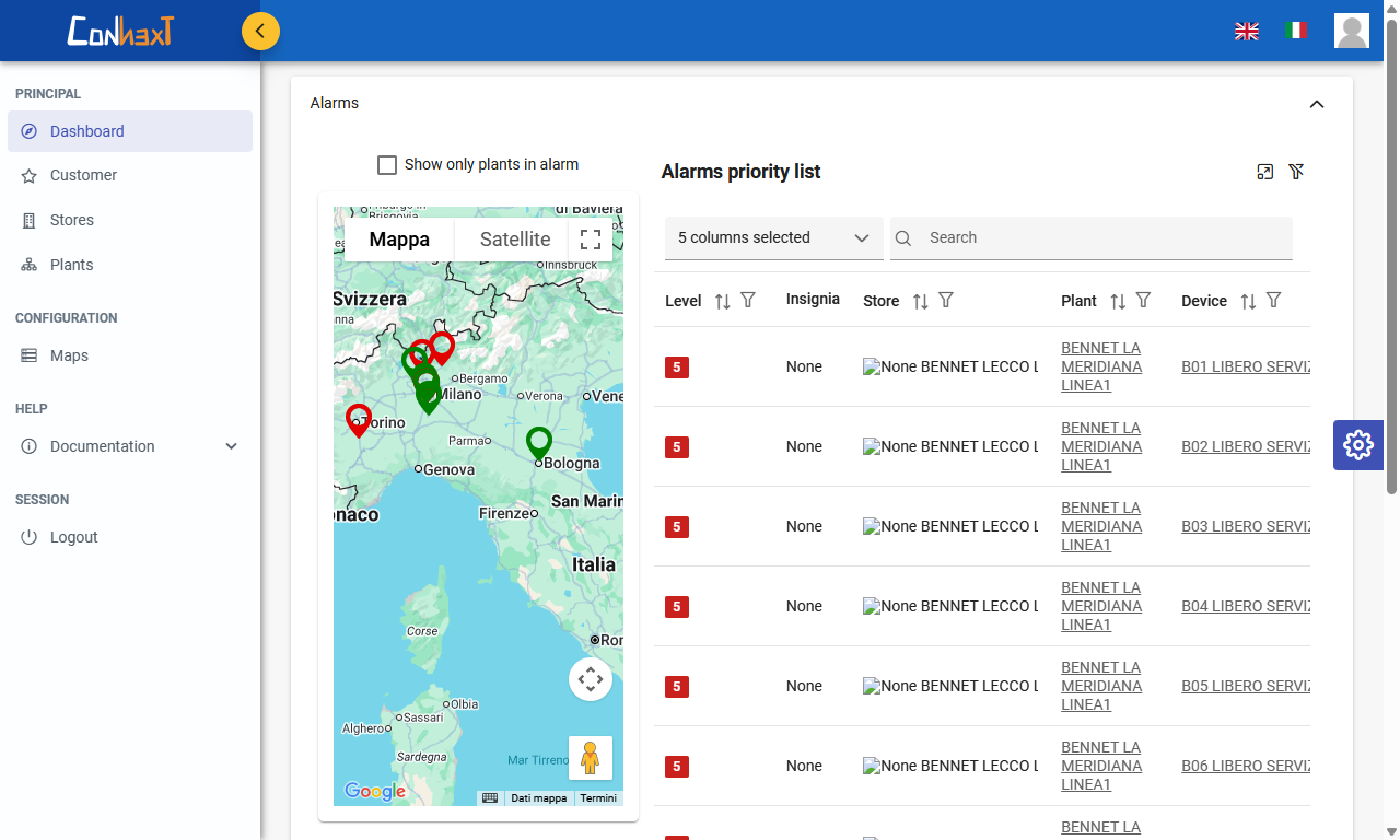 Attraverso la Dashboard è possibile naturalmente cliccare sulla riga di allarme o sull'indicatore di posizione per accedere direttamente all'impianto in allarme.