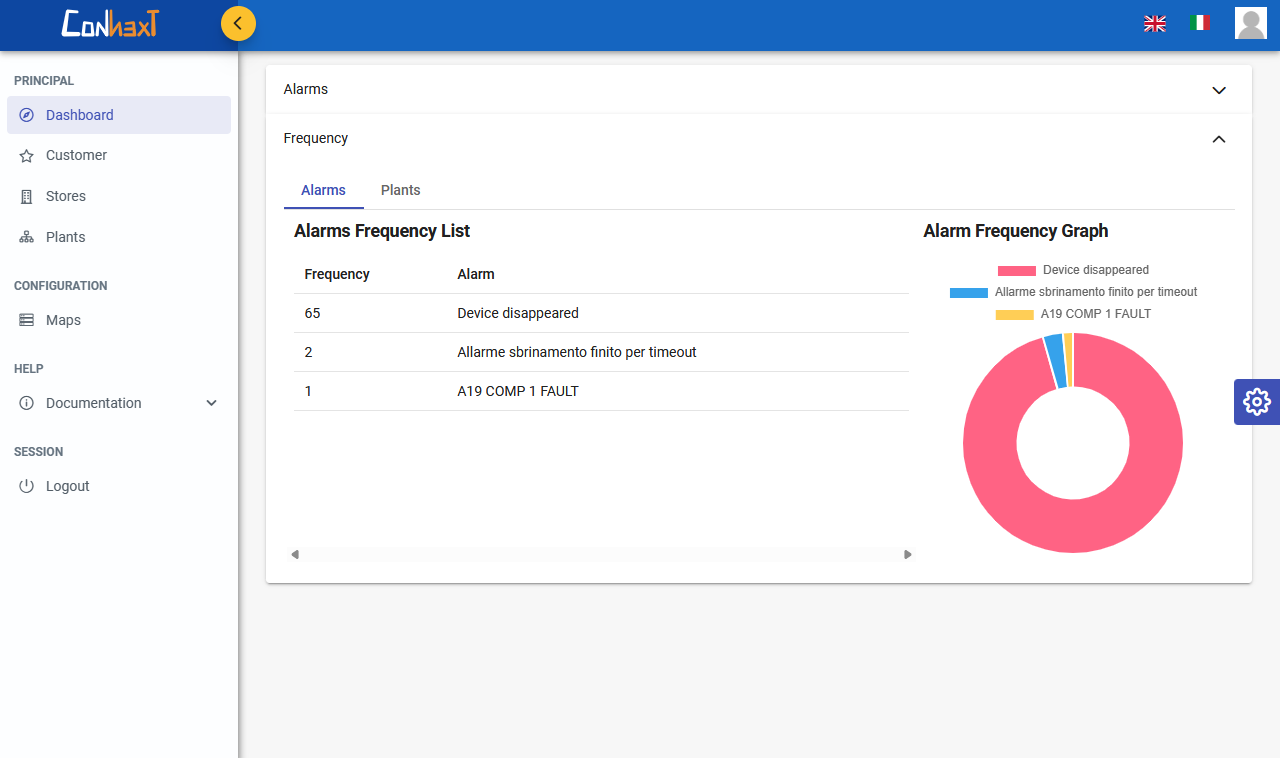 La Dashboard è pensata per dare in un unico colpo d'occhio la situazione degli impianti, principalmente intesa come impianti in allarme e impianti che presentano un funzionamento regolare.