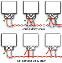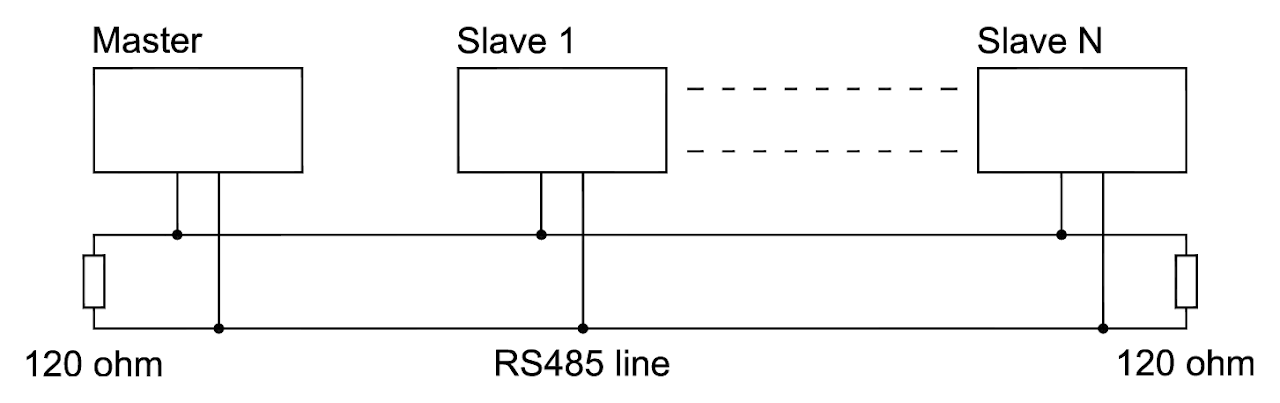 Il bus di collegamento RS485 è generalmente formato da un cavo a coppie attorcigliate (twisted-pair) che collega i vari dispositivi. La sezione del cavo può essere di 24 o 22 AWG per medie distanze, e dovrà essere aumentata nel caso di lunghe tratte. In particolare fare riferimento a cavi a norma RS485 schermati.