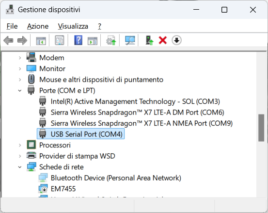 - Collegare il convertitore al PC, lo stesso deve comparire sotto i Dispositivi->Porte seriali