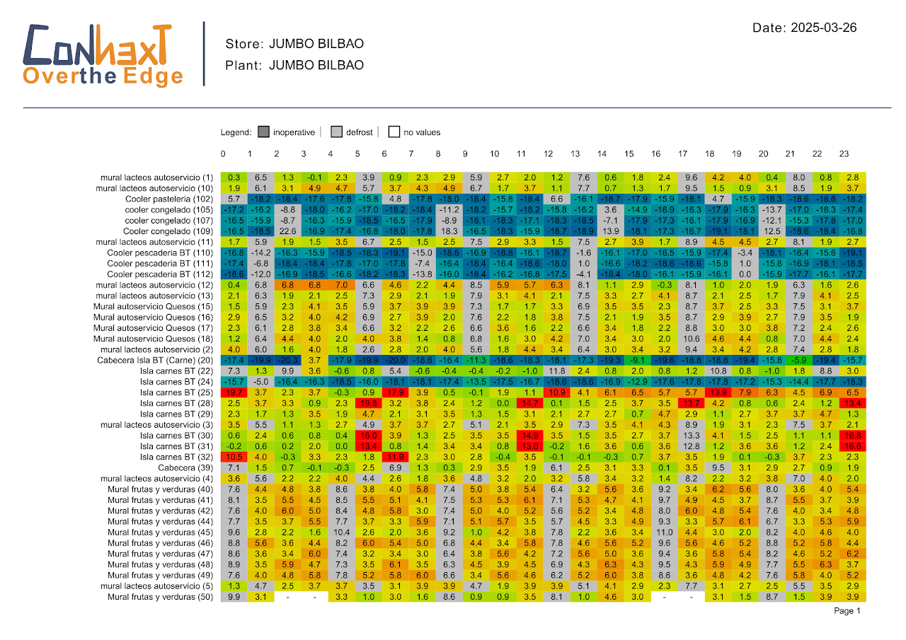 Il report fornisce in un unico colpo d'occhio la situazione giornaliera di tutto l'impianto, evidenziando con diversi colori l'andamento delle temperature. Sono anche evidenziati i periodi di defrost e i dispositivi arrestati.
